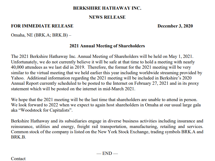 伯克希尔·哈撒韦公司表示,有关2021年会议的其他更多信息将提供在伯克希尔2020年年度报告中,该年度报告将于2021年2月27日发布在网上,也会提供在2021年3月中旬发布在网上的委托书中。