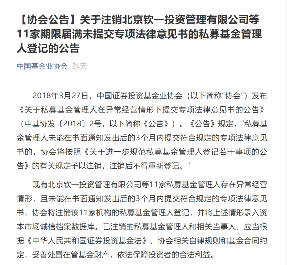 2018年3月27日,中基协同时发布《关于私募基金管理人在异常经营情形下提交专项法律意见书的公告》和《关于私募基金管理人在异常经营情形下提交专项法律意见书的公告》,对何种异常情形将予注销做了相应的界定。