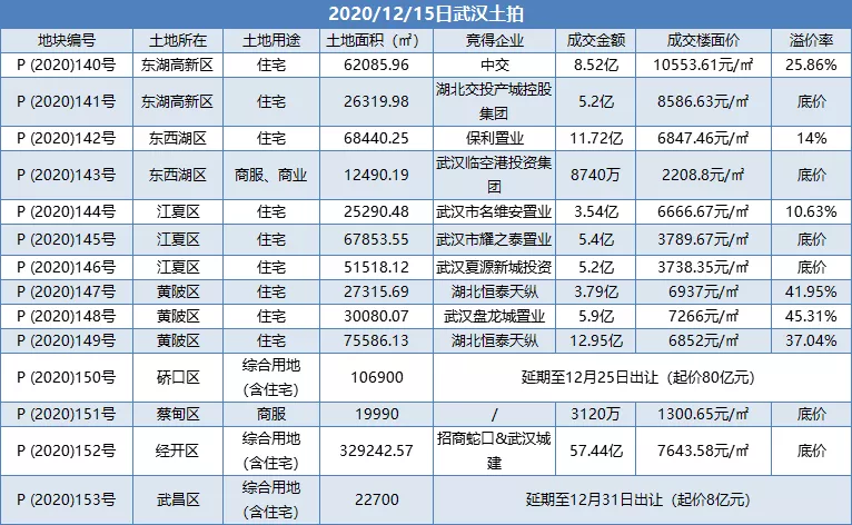 而开拍前便引起市场关注的P(2020)150号硚口区涉宅用地则延期至12月25日出让,业内分析指大概率是为做指标调整。湖北中原策略顾问中心总经理郑源滔表示,“该宗地块延期出让应该是资金筹措的问题,地块总起价80亿元,保证金也较大,而接近年底大部分房企的拿地资金相对紧张。”