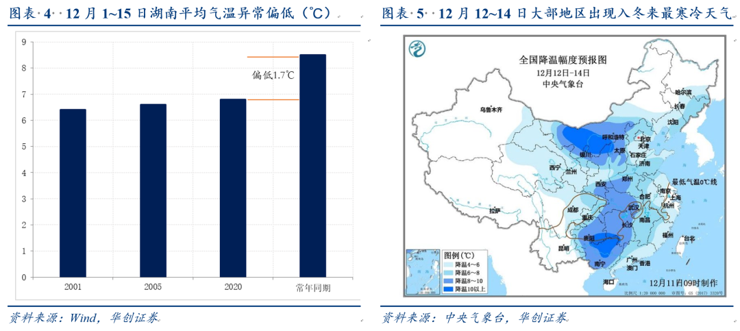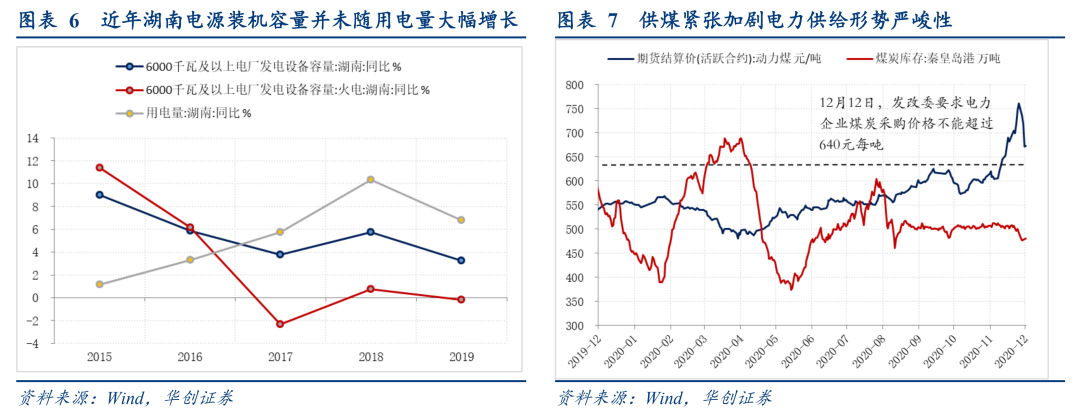 以湖南为例,湖南省发改委12月8日发文显示:“全省最大负荷已达3093万千瓦,超过冬季历史纪录,日最大用电量6.06亿千瓦时,同比增长14.1%,电力供应存在较大缺口”。究其原因,一是湖南近年来电源装机容量并未随用电量大幅增长,造成高峰缺电风险不断增加;二是湖南属大陆性亚热带季风气候,夏酷热、冬寒冷形成两个用电高峰,气温异常偏低造成居民空调用电需求陡增,冬季枯水使湖南水电调峰能力偏弱,新能源体量尚小;三是近期北方供煤紧张,加剧电力供给形势严峻性:11月30日湖南全省电煤库存同比下降18.5%,而近期动力煤期货涨破700元/吨,发改委要求电力企业煤炭采购价格不能超过640元/吨,供煤形势持续紧张。目前秦皇岛港煤炭库存仍在500万吨低位水平徘徊(600吨附近为正常水平),供煤紧张或仍将持续,后续春运运力有限可能形成干扰。