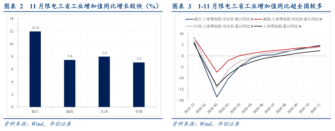 第二类是“主观控电”,主要出于突击完成节能减排目标需要,后续影响可能较小,浙江属于这种情形。一方面,正如发改委回应的,浙江是工业生产快速恢复拉动用电增长的典型。11月浙江出口同比增长20.8%,工厂加班加点生产,客观上增加了供电压力。但另一方面,与湖南、江西未规定限电结束时间不同,浙江明确规定限电截止到12月31日,显示其并不缺电,且通知明确是应省、市能源“双控”和“减煤”工作面临的严峻形势和绿色发展的要求:根据《浙江省进一步加强能源“双控”推动高质量发展实施方案(2018-2020年)》要求,到2020年,浙江将建立能源“双控”倒逼转型升级体系;在各市平衡基础上,累计腾出用能空间600万吨标准煤以上。