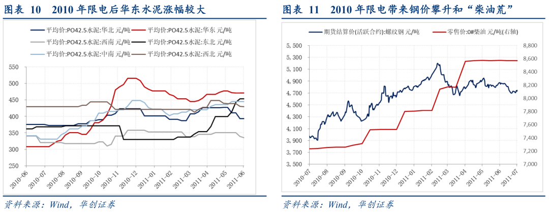 2010年限电导致当地乃至全国范围内工业品涨价。华东地区限电范围较广,供给紧张导致地区水泥价格由9月初350元/吨攀升至年末超500元/吨,钢价方面,螺纹钢期货由9月初约4300元/吨涨至2011年2月超5000元/吨。此外,当时浙江企业为保订单转用大功率柴油机发电生产,一度导致“柴油荒”,柴油零售价由2010年9月约7300元/吨涨至2011年4月近8300元/吨。