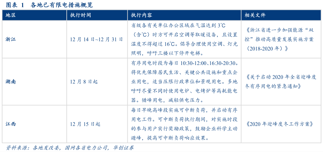 12月以来已有浙江、湖南、江西三省发出限电通知,多省电网处于“紧平衡”状态:浙江省机关事务管理局要求至12月31日期间,省级各有关单位办公区域在气温达到3℃以下(含3℃)时方可开启空调等取暖设备,且设置温度不得超过16℃,义乌发改局12月13日发布《节约用能倡议书》,倡议行政事业单位尽量少开或不开空调,提议合理使用灯光照明、三楼以下停开电梯。湖南省发改委要求自12月8日起全省启动限电措施,长沙市发改委呼吁全市所有空调一律控制在20℃以下,不使用电炉、电烤炉等高耗能电器,湘潭、株洲、岳阳等多市向市民发出有序用电倡议。江西发改委要求自12月15日起,早晚高峰实施可中断负荷,有序用电。此外,陕西、湖北、河北等多地电网用电负荷已创新高,电网处于“紧平衡”状态。