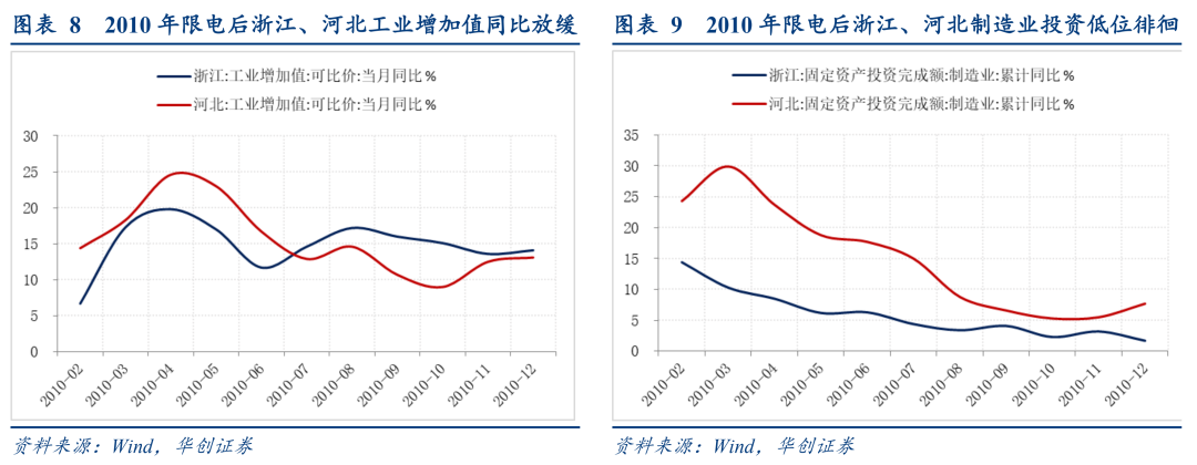 2010年限电造成当地工业增加值增速下滑。2010年12月15日是“十一五”节能减排任务考核截止期,按照国务院规定,若地方政府未能完成节能减排任务,主管领导将被问责,甚至免职。进入2010年9月时,仅北京、天津完成了节能目标,一些地方因完成节能减排任务无望,开始“拉闸限电”,最严重的是浙江、河北两省:在河北,拉闸限电现象遍布全省,工业发达的市县主要限制工业用电,工业不发达的一些市县连农电也一并限制,在浙江,9-10月有70%的企业被政府要求不同程度限电(11月降为30%)。9月开始限电后,两地工业增加值增速均有下滑,其中浙江工业增加值当月同比由8月17.2%降至11月13.6%,河北由8月14.6%降至10月9%,制造业投资方面,限电前两地累计增速已明显下滑,限电期间低位徘徊。