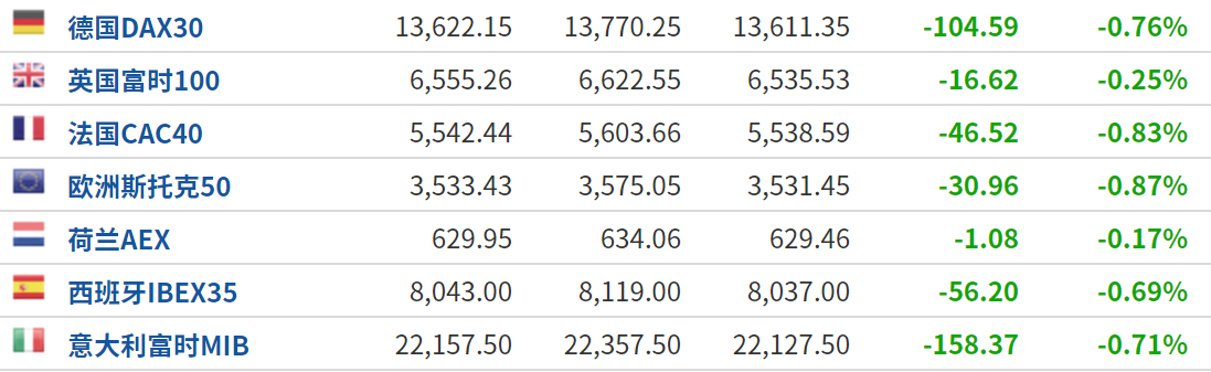 (周二欧洲主要股指情况,来源:Investing)