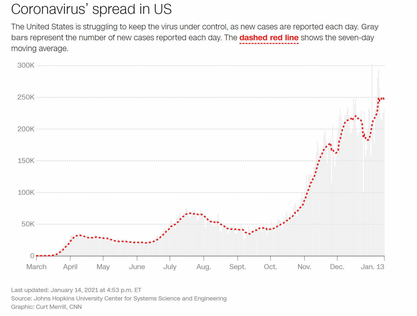 此外,在总统就职日前,所有人都将目光转向了华盛顿特区。该地区的疫情也从未如此严重过:目前华盛顿特区的日均新增病例超过320例,比前一周增加了38%。自疫情爆发以来,华盛顿特区已经报告了超过32600例新冠肺炎确诊病例,其中10%的病例是在2021年新增的。