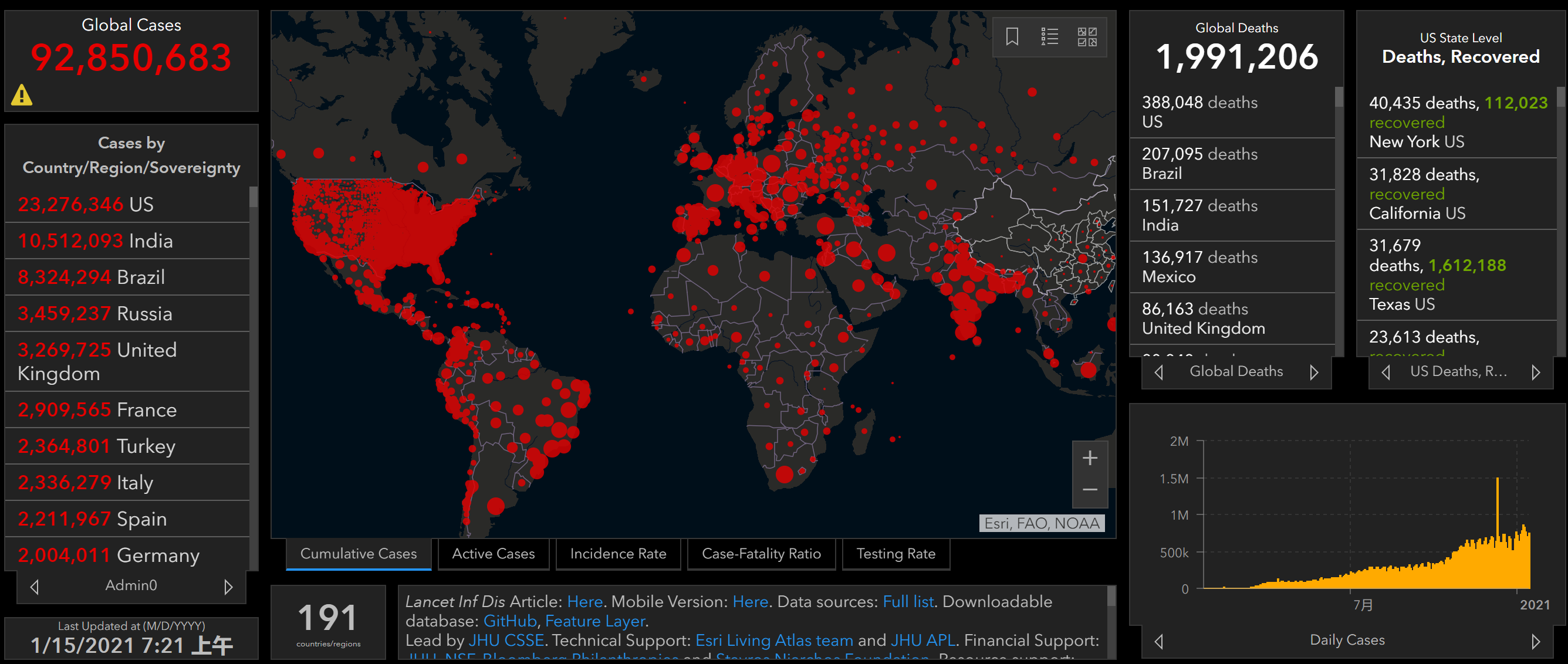 据约翰斯·霍普金斯大学的统计数据,截至发稿,美国累计确诊23276346例,累计死亡388048例。