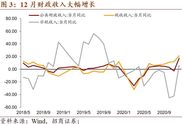 12月财政收入同比增速17.4%,大幅高于11月前值-2.7%,单月增速重新回正。细项看,12月财政收入主要拉动项包括税收收入中的消费税、增值税、个人所得税和契税等,非税收入同比也开始转正。12月消费税同比79.8%,大幅高于前值2.2%。12月增值税同比增速为7.8%,延续8月以来的持续正增长。12月个人所得税同比增24.5%,持续保持两位数速度增长,增速强劲。税收收入持续增长与经济数据向好一致,可持续性较强。同时受经济活动改善的影响,企业盈利提升,居民收入增长,企业所得税和居民个人所得税增长表现强劲。受地产销售增长、汽车消费向好带动,契税、汽车购置税增速也表现较好。
