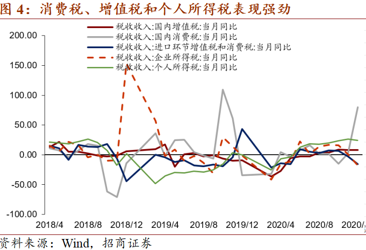 2020年全年财政收入累计18.3万亿,同比下降3.9%,自4月以来降幅进一步收窄。其中,中央一般公共预算收入累计8.3万亿,同比下降7.3%;地方一般公共预算本级收入累计10.0万亿,同比下降0.9%,全国税收收入同比下降2.3%,自4月以来降幅逐渐收窄;非税收入同比下降11.7%。下半年经济活动改善,税收收入增长强劲。全年来看,个人所得税累计同比11.4%,或将对未来居民消费带来负面影响。