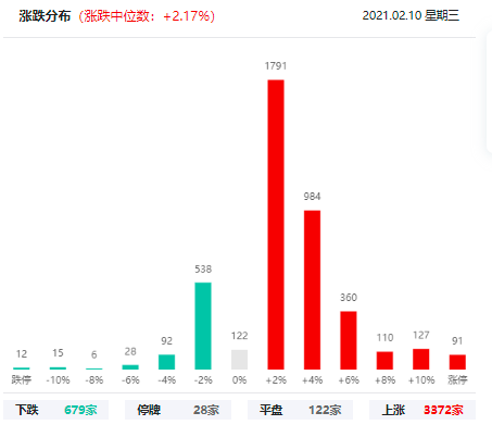 赚钱效应方面, 上涨家数高达3372家,下跌家数仅679家,涨跌比要接近5!