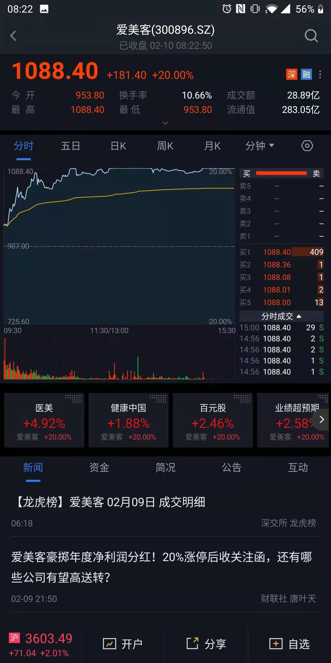 2月9日该股股价创出1088.40元的历史新高,超越石头科技成为A股第二高价股。也成为继贵州茅台、石头科技后,A股市场的第三只千元股。