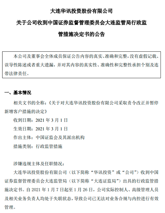 2月8日和3月1日,华讯投资分别收到大连证监局下发的行政监管措施事先告知书。大连证监局认为,由于公司实际控制人、高级管理人员以及相关业务负责人均处于失联状态,导致公司已无法对业务合规与内控进行有效管理,上述行为违反了《证券投资顾问业务暂行规定》规定。大连证监局对华讯投资采取责令改正,暂停新增客户六个月的监督管理措施。
