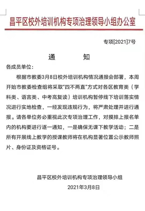 网上流传的文件名为《关于继续做好我区中小学学科类培训机构、外语语言能力培训机构及与中高考高度相关的学科类培训机构停止线下培训和集体活动的通知》(下称“通知”)。
