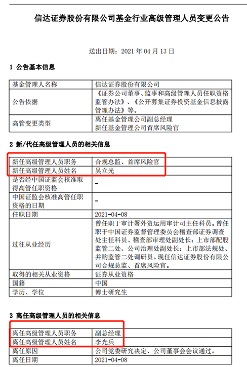 4月13日,信达证券公告称,信达证券副总经理李光兵转任副巡视员,首席风险官由公司合规负责人吴立光担任,原首席风险官邓强离任,继续担任公司副总经理。接近人士称,信达证券近期还将出现一些变动。