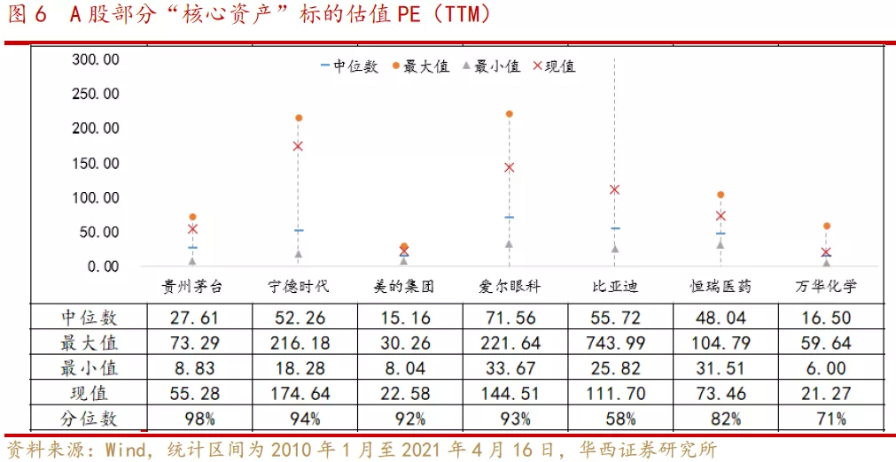 调整后的A股部分核心资产估值仍偏高。截至4月16日,A股部分核心资产仍高于历史中位数水平,贵州茅台、宁德时代、美的集团、爱尔眼科当前PE_TTM位于2010年以来90%以上分位数,恒瑞医药高于2010年以来80%分位数,万华化学高于70%分位数。