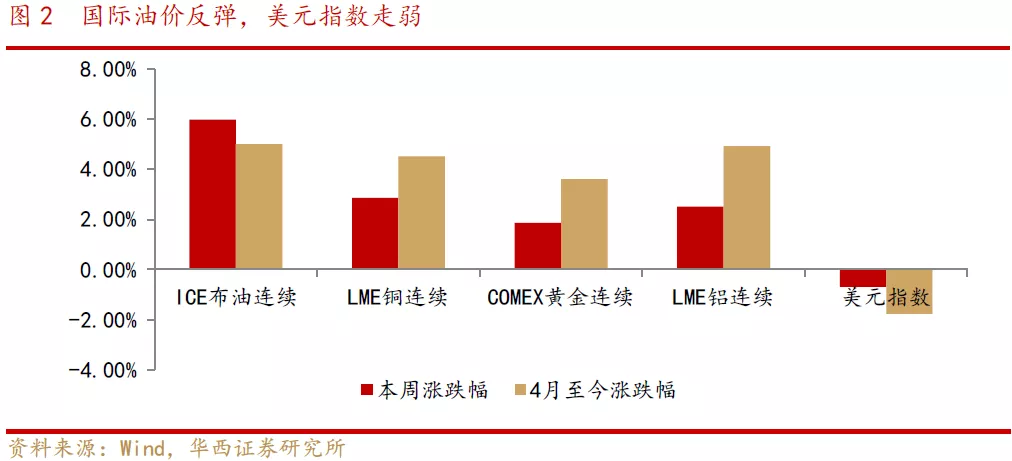 美债收益率本周有所回落,截至4月16日,10Y美债收益率跌至1.59%,黄金受提振,本周COMEX黄金上涨1.86%;国际油价强劲反弹,ICE布油本周涨幅6%,OPEC上调了今年全球石油需求预期,从此前预期的589万桶/日上调至595万桶/日,表示刺激计划的落地及疫情封锁措施放松将持续推动世界经济复苏。