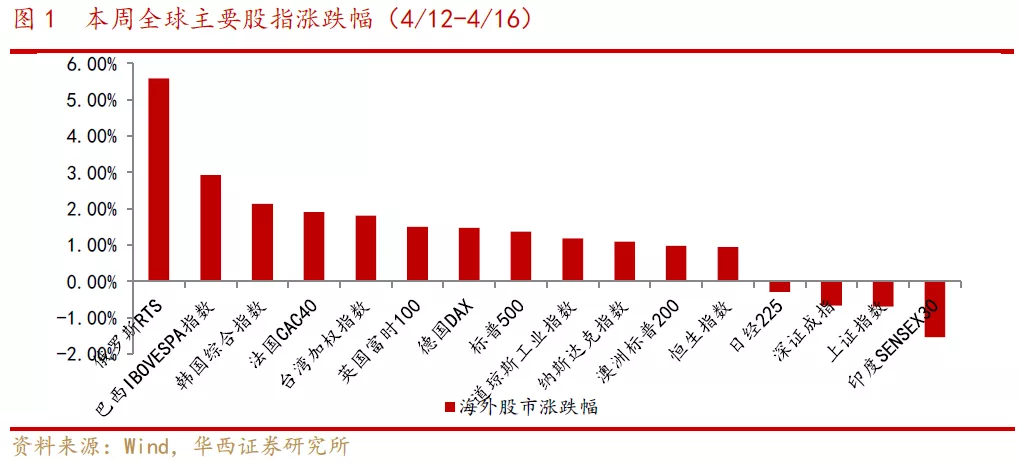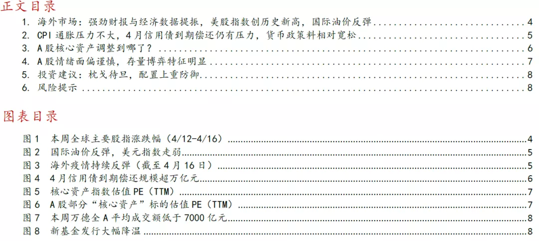 一、海外市场:强劲财报与经济数据提振,美股指数创历史新高,国际油价反弹。本周标普500、道指再创历史新高,强劲的企业财报与经济数据提振经济复苏预期:美国劳动力市场数据改善,4月10日当周初请失业金人数57.6万人,创2020年3月以来新低;美国3月零售销售环比增长9.8%,创去年5月来新高;3月份制造业产值创8个月来最大增幅;截至目前美股多家企业财报高于市场预期,投资者信心得到增强。OPEC本周上调今年全球石油需求预期,ICE布油本周上涨6%。