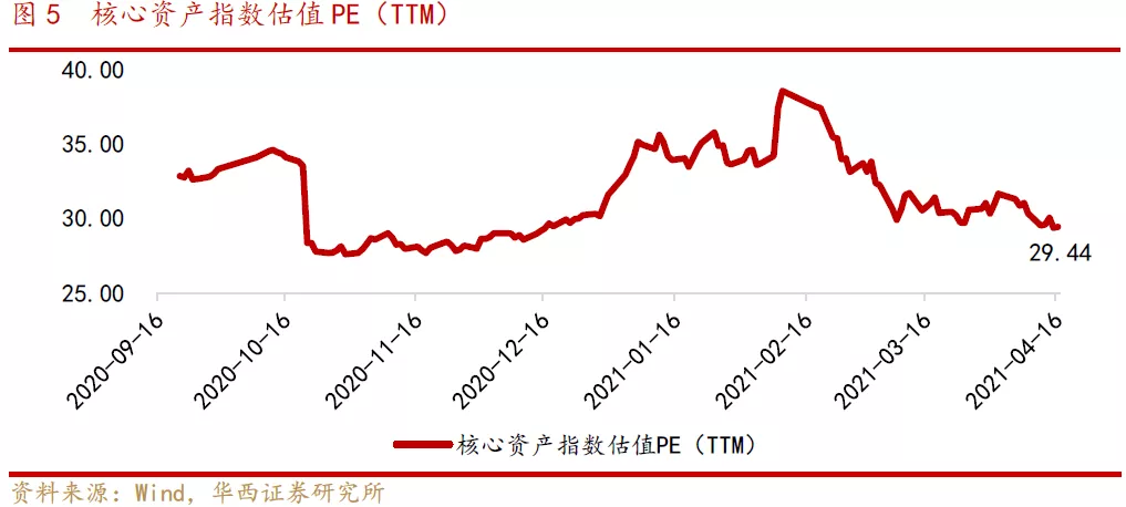 我们以Wind茅指数代表核心资产指数,从过去市盈率看,今年2月份核心资产指数估值达到阶段性高位,PE(TTM)高点达38.57;经过春节后的调整,核心资产指数估值有所下降,截至4月16日,PE(TTM)为29.44,估值回落至2021年初附近,仍高于2020年11月、12月估值水平。
