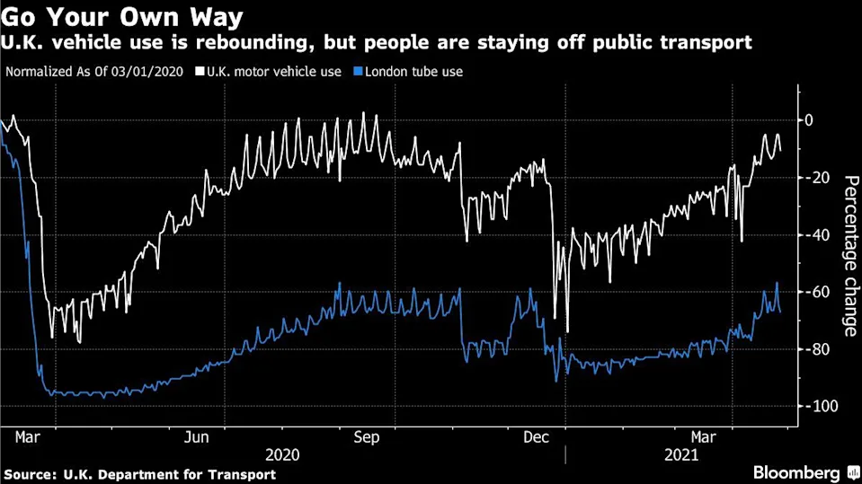 在美国,高速公路上的驾驶里程已经开始超过2019年的水平。在欧洲,彭博编制的涵盖15个国家的道路拥堵指数目前已升至10周以来的最高水平。英国的燃料销量超过了疫情前的水平,而且几乎没有放缓的迹象。