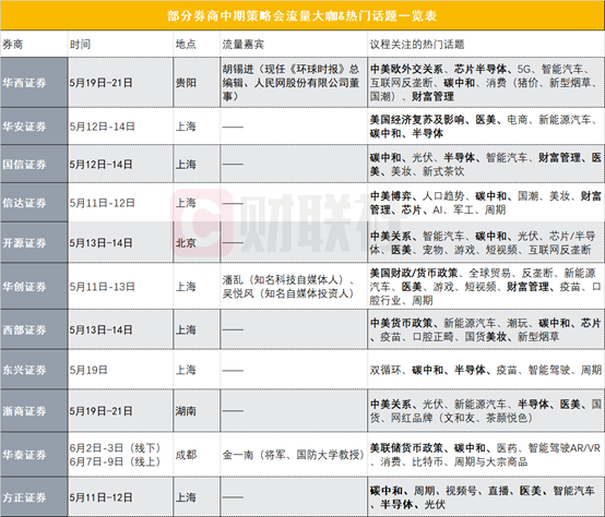 记者梳理发现,策略会议题基本上覆盖了近期市场、行业关注的热门领域,中美关系、碳中和、医美、半导体、新能源汽车、财富管理等成为高频词;除专家学者、行业领袖、券商研究员等业内人士,众多圈外流量大咖的强势助阵,也成了今年中期策略会的一大看点。