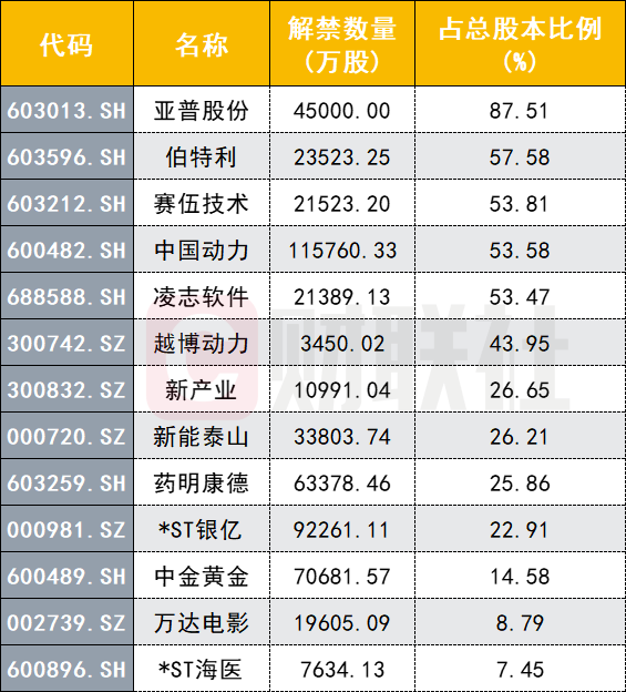 此外,从解禁股数量占总股本的比例来看,下周有5只个股解禁股数量占总股本比例超过50%,分别为亚普股份、伯特利、赛伍技术、中国动力、凌志软件,解禁比例分别为87.51%、57.58%、53.81%、53.58%、53.47%。