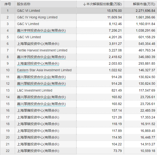 而药明康德本次解禁的股份均为该公司在A股上市时的首次公开发行限售股,共涉及G&C VI Limited、G&C V Limited、嘉兴宇祥投资合伙企业(有限合伙)等22名股东,其中多名股东是药明康德实控人旗下的公司。