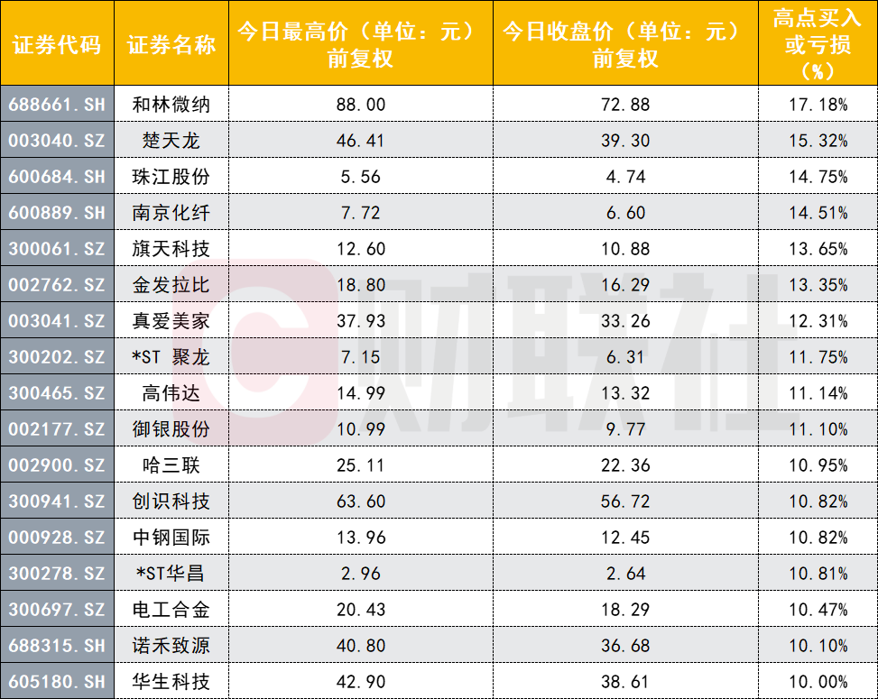 据星矿数据,剔除部分新股后,今日有17只个股最高价及收盘价的差值在10%及以上,也就是说,当日在股价高点买入相关个股的投资者们或将承受不小的损失。