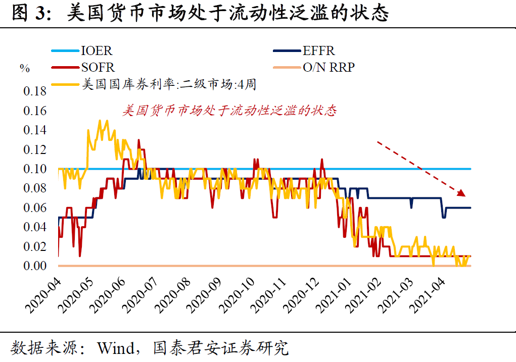 随着拜登财政补贴的发放,美联储的财政存款余额不断减少,叠加QE仍在继续,银行准备金规模快速膨胀,货币市场流动性泛滥。美国货币基金面临“资产荒”,由于流通中的短期国库券不断缩减,所以短债不够买,只能转向美联储隔夜逆回购工具,导致货币市场利率不断接近0%的利率下限,这可能触发美联储对利率走廊进行技术调整来避免负利率的出现。