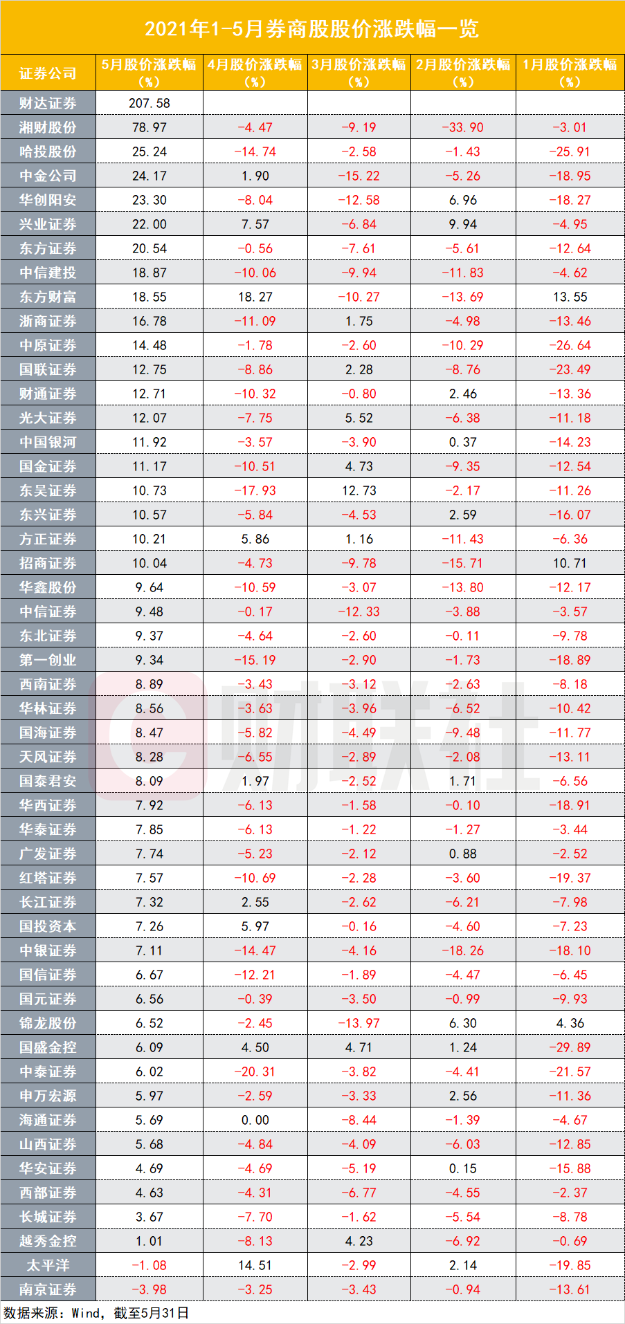 从跌幅榜看,前4月垫底券商跌幅均超过两位数。具体来看,1月垫底的是国盛金控(-29.89%),2月湘财股份(-33.90%)排最末,3月中金公司(-15.22%)垫底,4月跌幅最高为中泰证券(-20.31%),5月南京证券(-3.98%)领跌,跌幅为个位数。