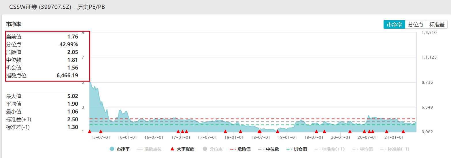 从中证申万证券行业指数来看,6月1日,该指数市净率为1.76,以10年期来看,历史分位点为42.99%,与历史中位数1.81(对应50%分位点)较为接近,也接近去年6月19日起涨点1.71的位置。