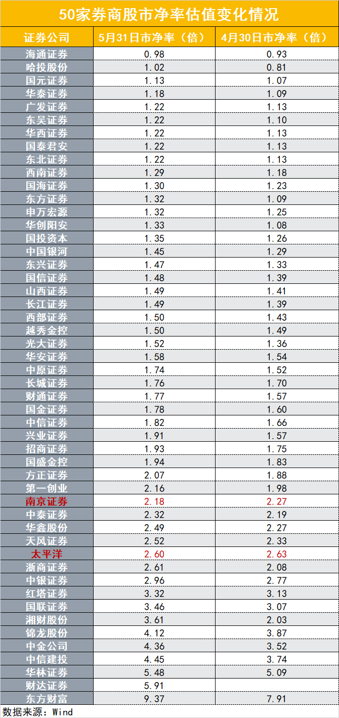截至5月最后一个交易日,市净率由低往高排在第一至第十的分别为,海通证券(0.98)、哈投股份(1.02)、国元证券(1.13)、华泰证券(1.18)、广发证券(1.22)、东吴证券(1.22)、华西证券(1.22)、国泰君安证券(1.22)、东北证券(1.22)、西南证券(1.29)。这10家券商市净率均低于1.3,其中海通证券市净率低于1。