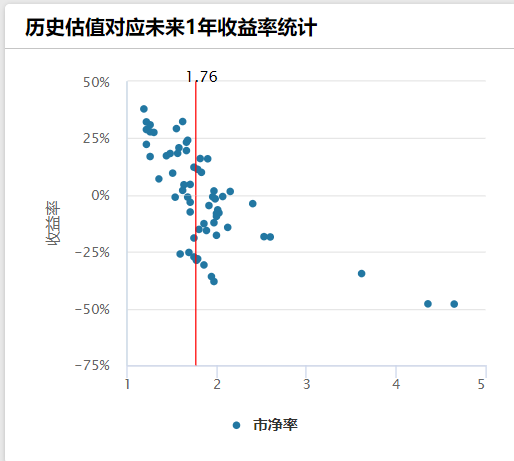 此外,以历史估值对应未来1年收益率统计,历史上市净率位于1.76附近的收益情况大致上涨跌参半。