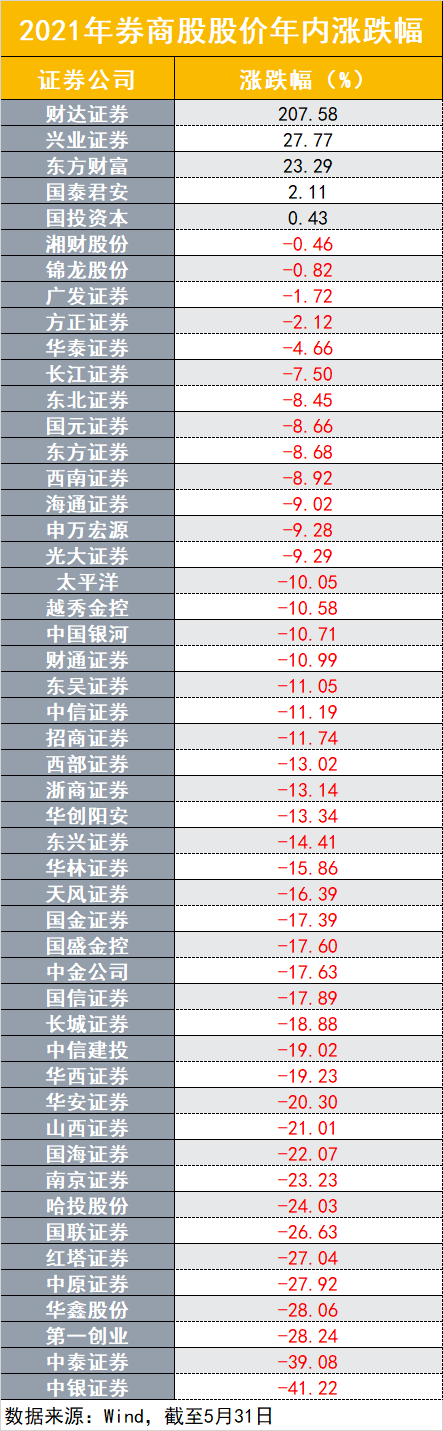 从年内涨跌幅来看,券商股总体表现低迷,45家年初至今涨幅仍为负数。股价上涨券商表现亦冷热不均,财达证券以207.58%的成绩居首,兴业证券和东方财富分列二三名,涨幅分别为27.77%和23.29%,第四名国泰君安(2.11%)、第五名国投资本(0.43%)涨幅均不足3%。