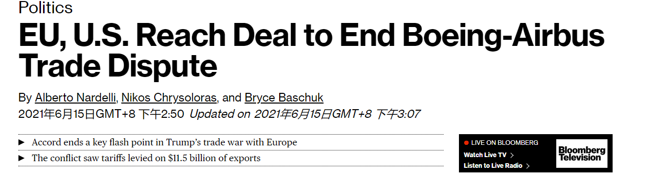 财联社(上海,编辑 周玲)讯,外媒当地时间周二报道,欧盟官员表示,美国和欧盟同意结束长达 17 年飞机补贴争端。意味着四位美国总统历时17年,对价值115亿美元的跨大西洋出口产品征收关税的贸易纠纷终于达成和解。这份具有里程碑意义的休战协议,将利好美国飞机制造商波音(Boeing)和欧洲空中客车公司(Airbus),也利好双方其他数十个受关税影响的行业。