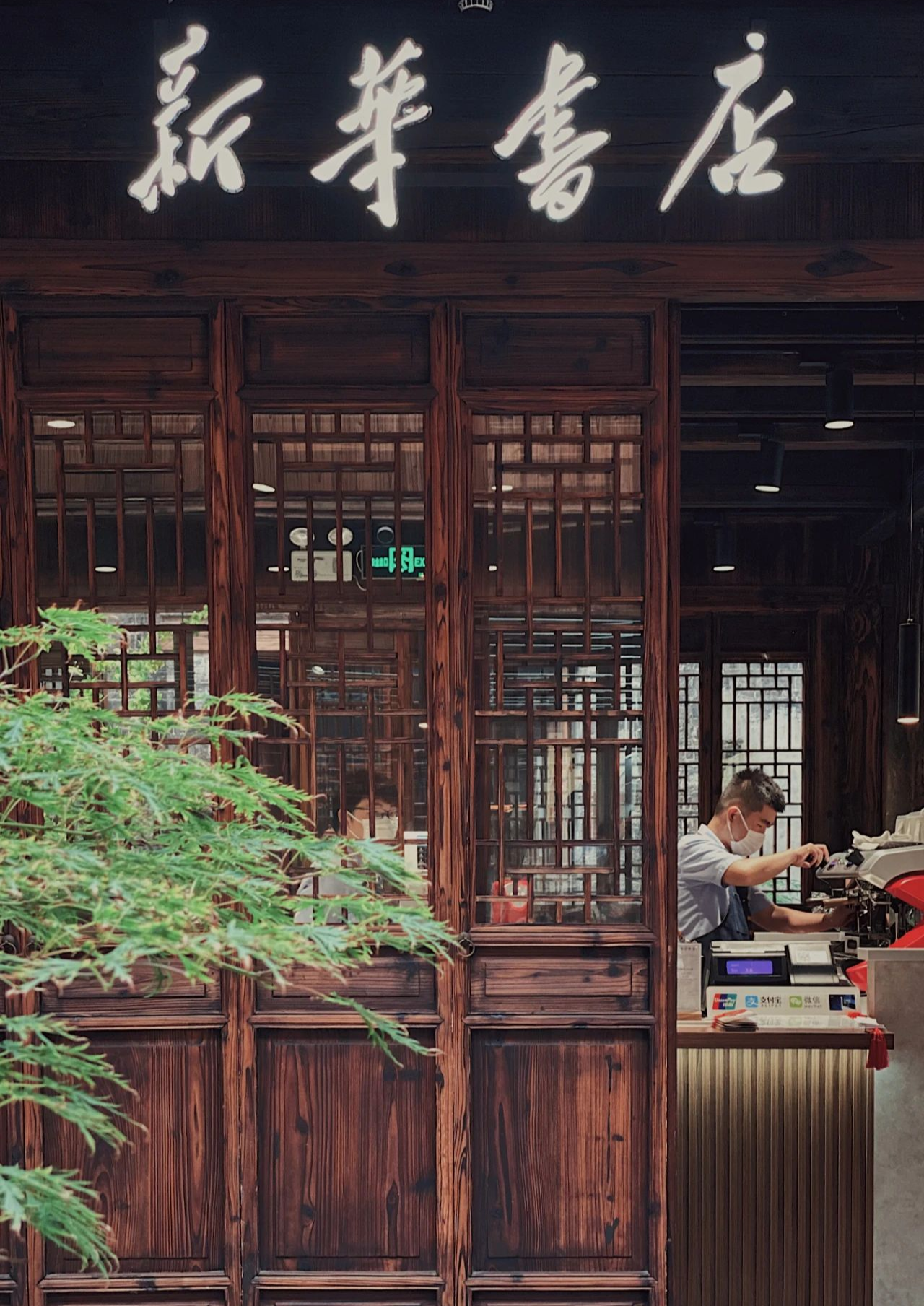 白墙黛瓦木质门框,脚下是湿漉漉的青石板,前面门框上挂着“新华书店”字样,老字号书店在这样的环境中毫无违和感。