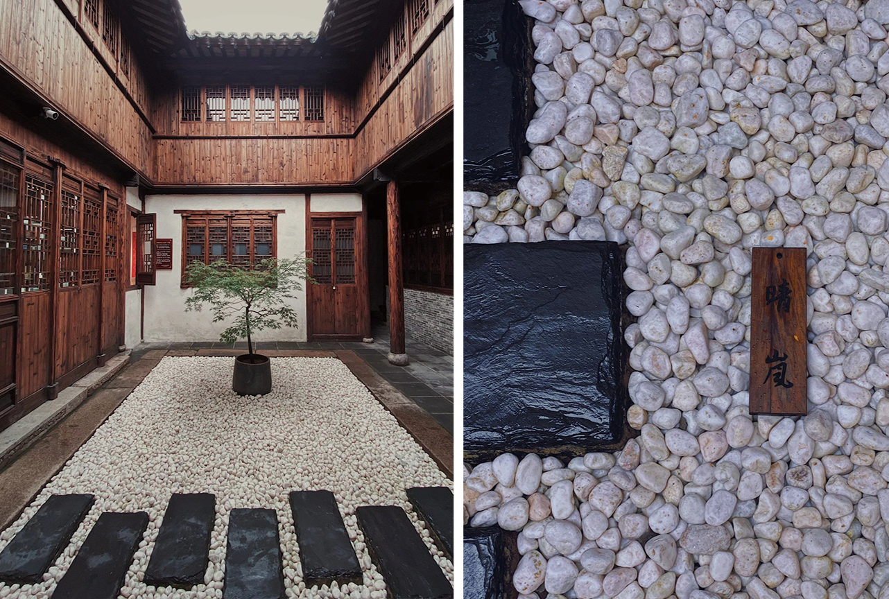 中庭铺着一方白色鹅卵石,恰似一片积雪,呼应“映雪”这一名字。青石板道路色泽古朴自然,搭配绿植,显得禅意十足。