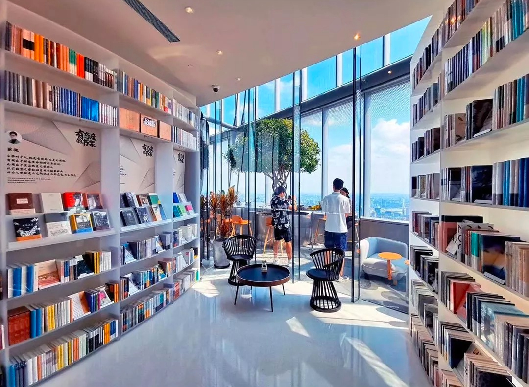 与上述提到的“朵云书院”不同,这家朵云把书店搬到了高空。52层239米的高度刷新魔都最高书店的记录,2200㎡的超大空间存放着超过6万册图书,吸引了一波波的人前往打卡。可以在这样的风景之中看书,实属难得。