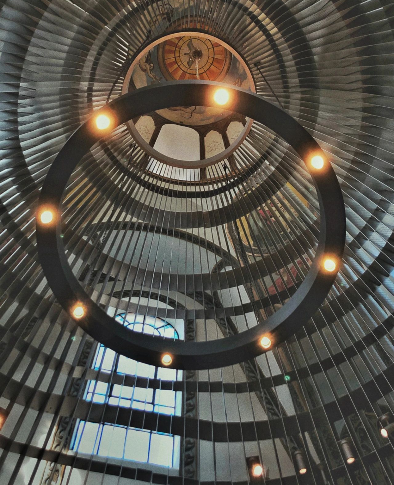 进入书店内部的人常常会被这10余米高的穹顶所震撼。穹顶保留着原先的画作,中间的环形吊灯从屋顶垂下,似有一股神圣的力量。