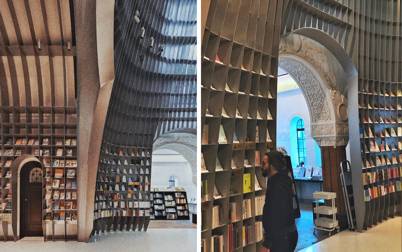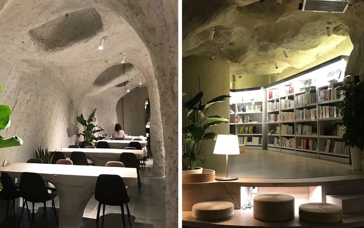 岩石质感的拱门层层叠叠,让整个空间看起来十分原始。在这里除了种类丰富的图书之外,最里面还有一片喝咖啡的区域。