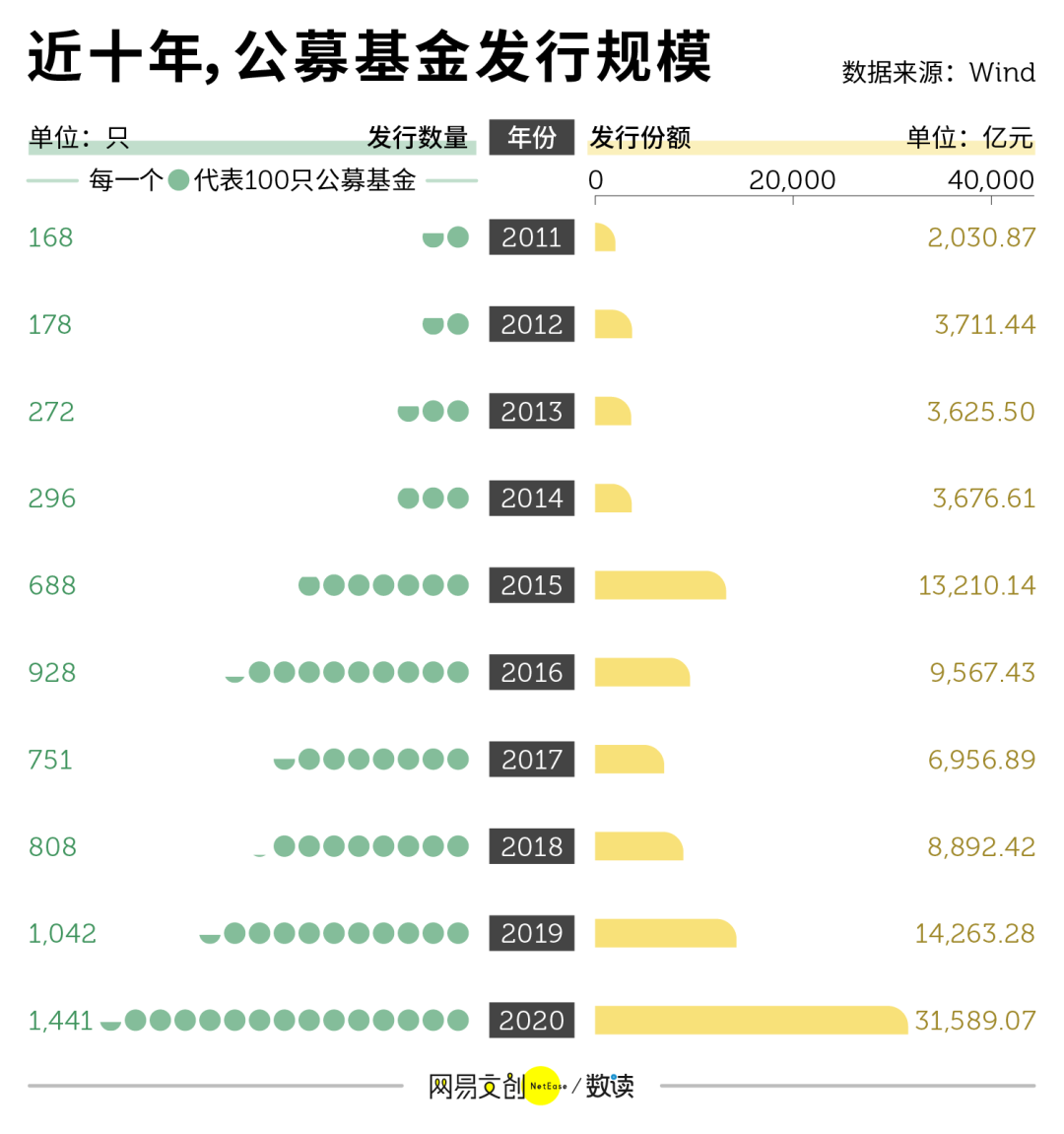 比如仅 2020 年,国内就成立了各类新基金 1441 只,发行总份额达到创纪录的了 3.16 万亿元,而 2017 年到 2019 年 3 年的公募基金发行总和不过才 3.01 万亿元。