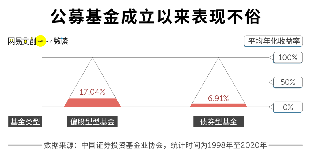 但其实,长期来看,公募基金为持有人创造了不错的收益。根据统计,从1998年基金诞生到2020年年底,偏股型基金的平均年化收益率可以达到17.04%,债券型基金达到 6.91%。