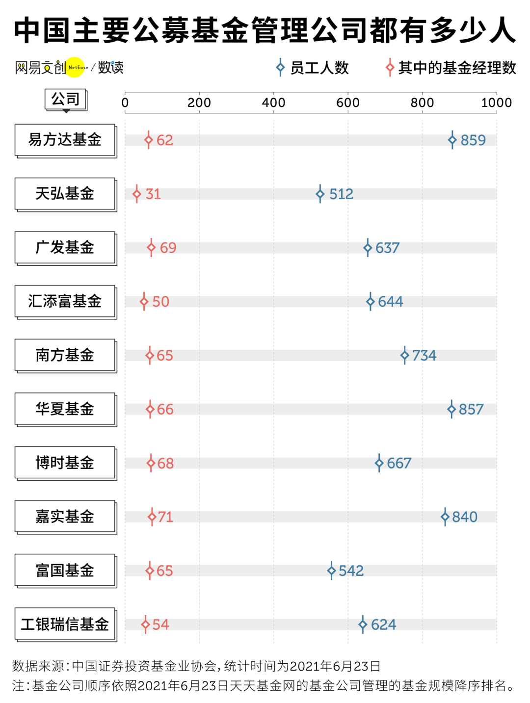 根据中国证券投资基金协会的公示,目前中国头部前十的基金公司中,都有五百人以上的团队,而其中基金经理的数量大概只占了 10% 左右。