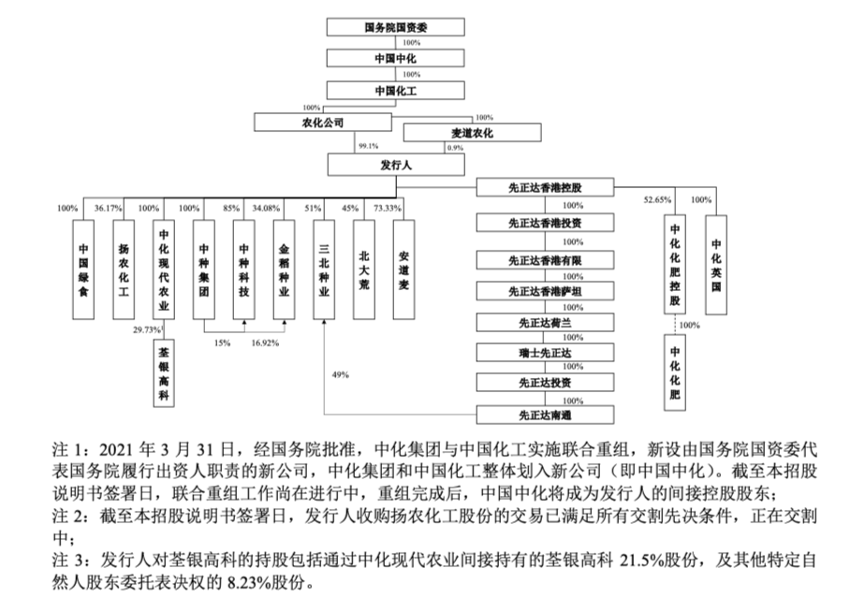 招股书显示,中国化工农化有限公司(下称“农化公司”)直接持有先正达集团99.1%股份,为集团控股股东,同时农化公司的全资子公司麦道农化持有先正达集团0.9%股份。