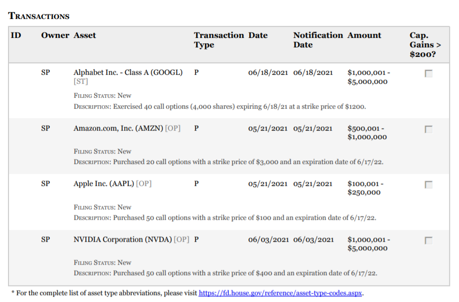 在今年三月,保罗行权了价值195万美元的微软看涨期权,此时距离该公司确保获得美国国防部价值220亿美元的作战部队AR头盔合同不到两周时间;同样在今年一月,在拜登新政府将电动车列为重要改革方向前,保罗亦大手笔买入了特斯拉看涨期权。
