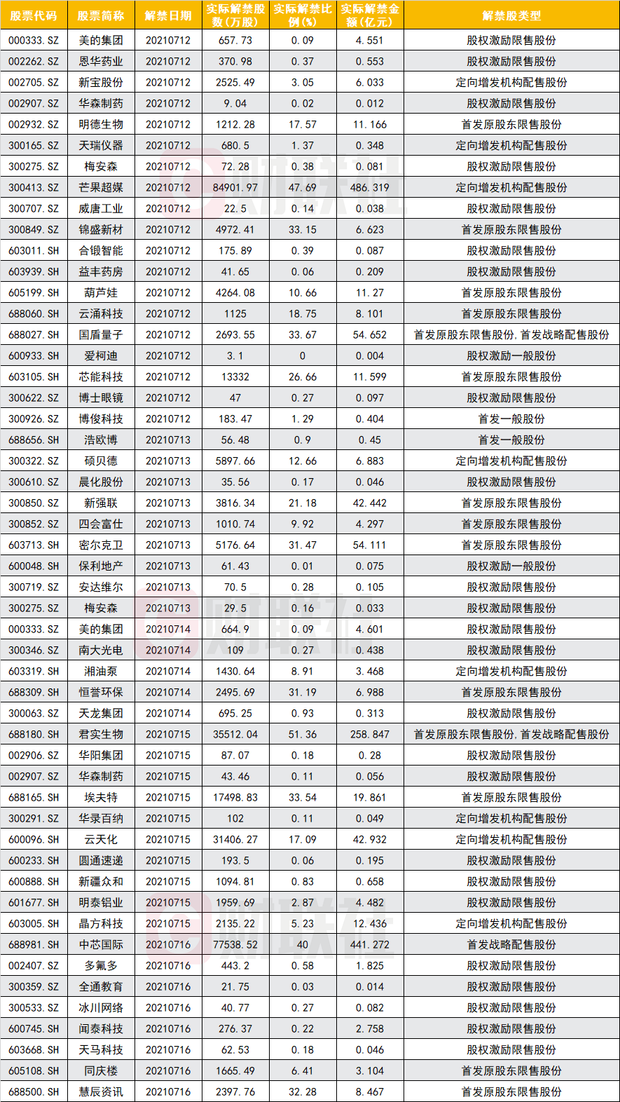 实际解禁比例小于千分之一的则有爱柯迪、保利地产、华森制药、全通教育、圆通速递及益丰药房,均来自股权激励。