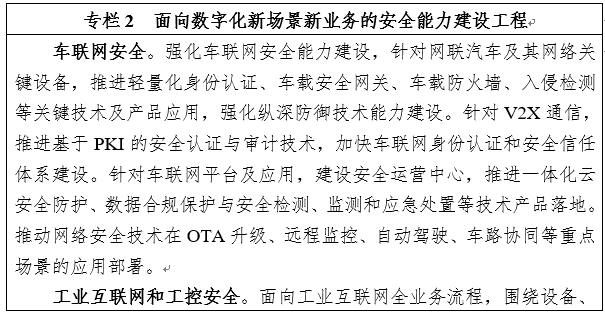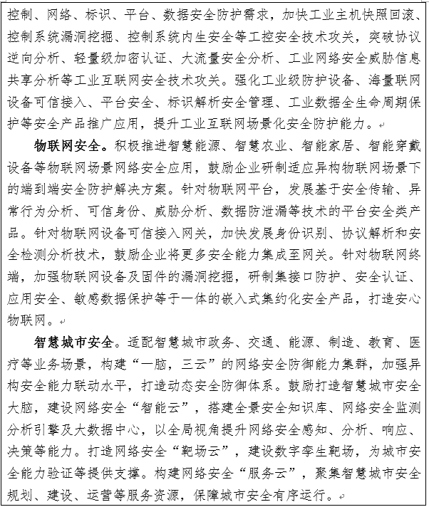 8.加快新兴融合领域安全应用。全面推动工业互联网企业网络安全分类分级落地实施,面向原材料、装备制造、消费品、电子信息等行业,针对联网工业企业、平台企业、标识解析企业等加强网络安全分级防护体系建设。面向车联网安全,鼓励整车企业提升汽车、网络关键设备及云平台的安全防护与检测能力,强化路侧联网设施安全,推动车联网示范区、先导区和测试场安全解决方案的测试验证和示范应用。实施物联网基础安全“百企千款”产品培育行动,面向物联网终端、网关、平台等物联网关键环节,开展物联网安全检测、异常处置和公共服务,打造“物联网安心产品”。