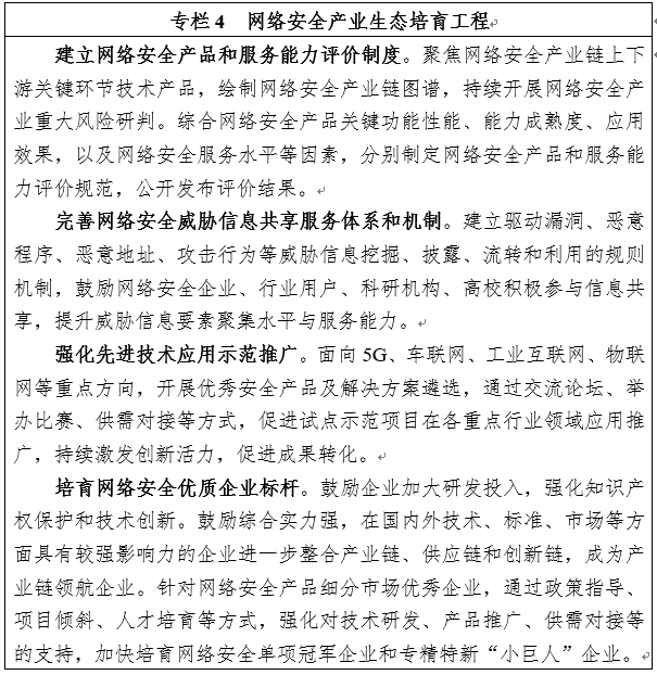 ——企业发展。一批质量品牌、经营效益优势明显的具有网络安全生态引领能力的领航企业初步形成,一批面向车联网、工业互联网、物联网、智慧城市等新赛道的“专精特新”中小企业群体迅速成长,网络安全产品、服务、解决方案单项冠军企业数量逐步壮大。