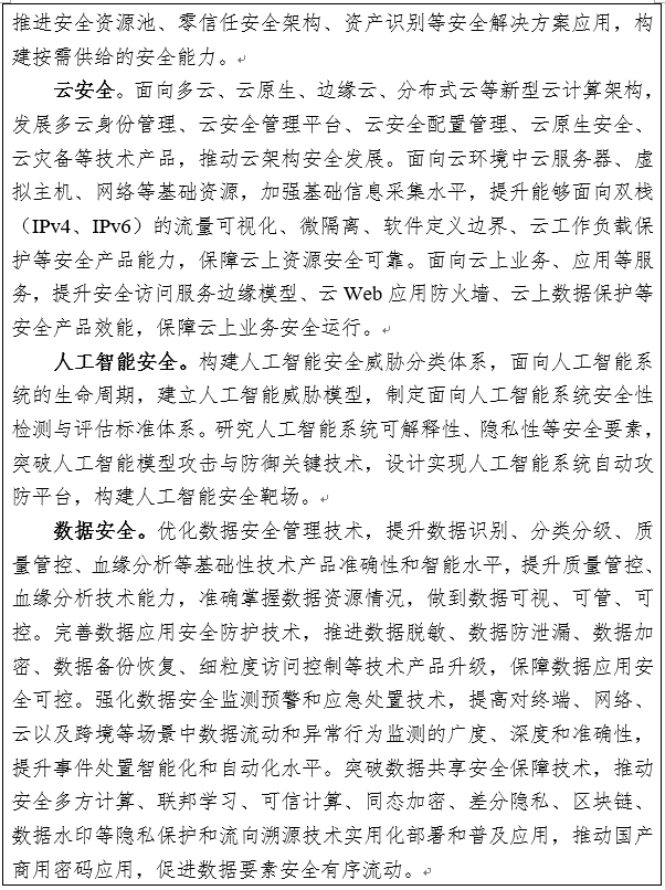 9.推动关键行业基础设施强化网络安全建设。推动能源、金融、交通、水利、卫生医疗、教育等行业领域加强资产识别、设备防护、边界防护、身份认证、数据安全、应用安全等技术手段建设,提升重要系统、关键节点及数据的安全防护能力。支持建立态势感知、通报预警、应急响应、安全运营等安全机制及纵深防护体系,不断提高风险防范和应急处置能力。推进零信任、人工智能等技术应用,提升防护体系效能。