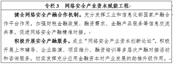 11.加大产业基金投入力度。引导国家制造业转型升级基金等政府引导基金向网络安全新技术、新模式以及融合创新领域倾斜,适时推动设立国家级网络安全产业引导基金,加速新产品和服务在市场中成熟落地。鼓励地方政府将网络安全产业纳入政府引导基金投资范畴,支持本地区网络安全企业发展。