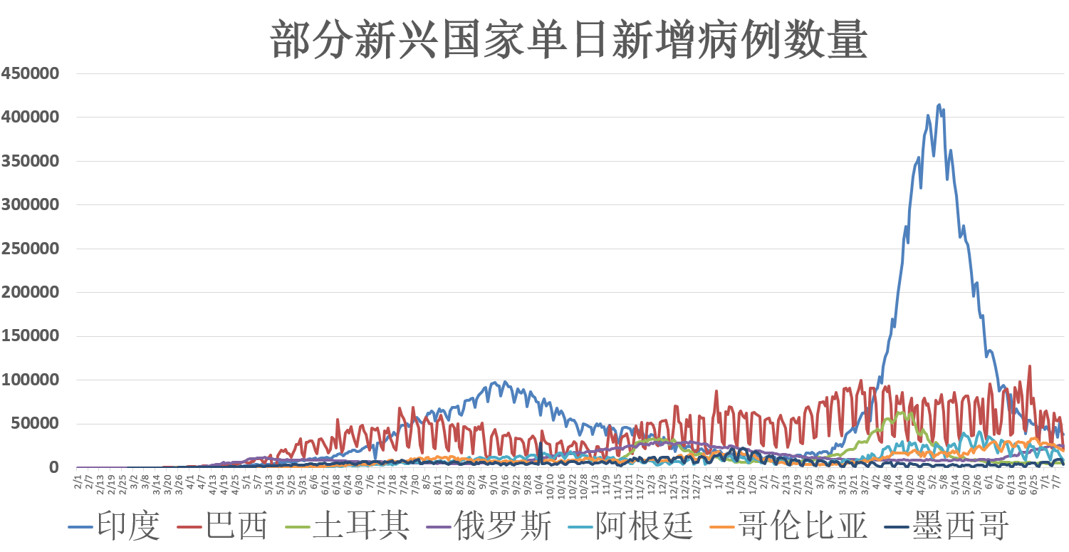 除此之外,新兴国家中印度(30874376例)和巴西(19089940例)的疫情形势仍处于高位;而土耳其(5465094例)、俄罗斯(5738000例)、阿根廷(4647948例)、哥伦比亚(4471622例)也是目前病例仍在显著增长的经济体。